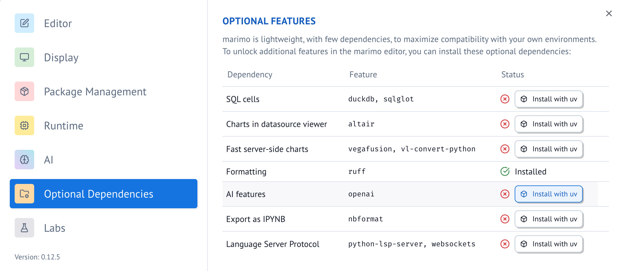 Enabling AI code generation. To enable AI code generation, first install required dependencies through the notebook settings.